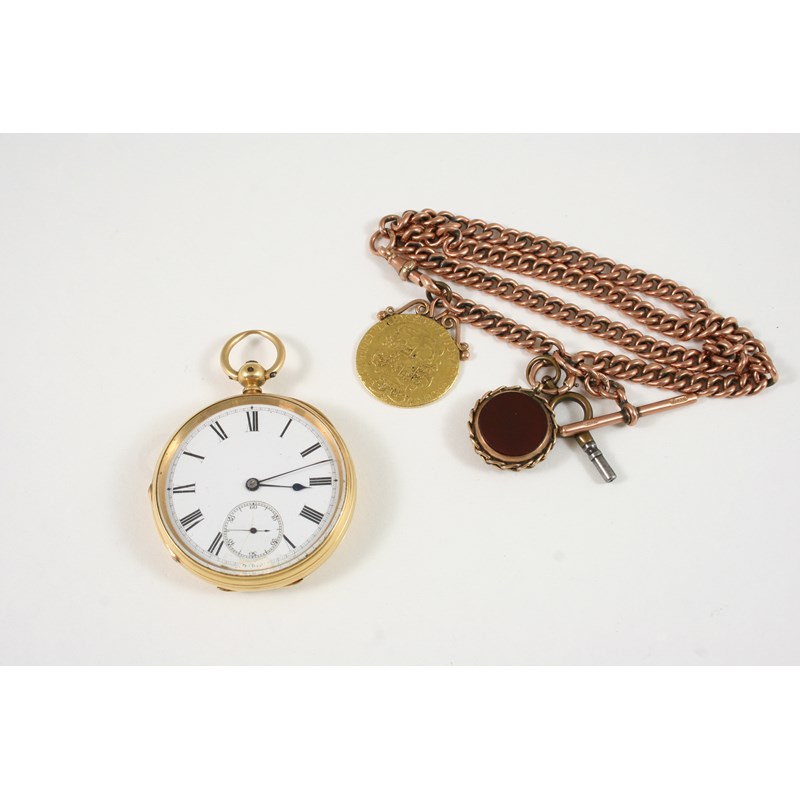 the white enamel dial with Roman numerals and subsidiary seconds dial, 45mm. dia., together with a 9ct. gold watch chain, suspending a compass and a mounted guinea, total weight of watch chain 59.5 grams.