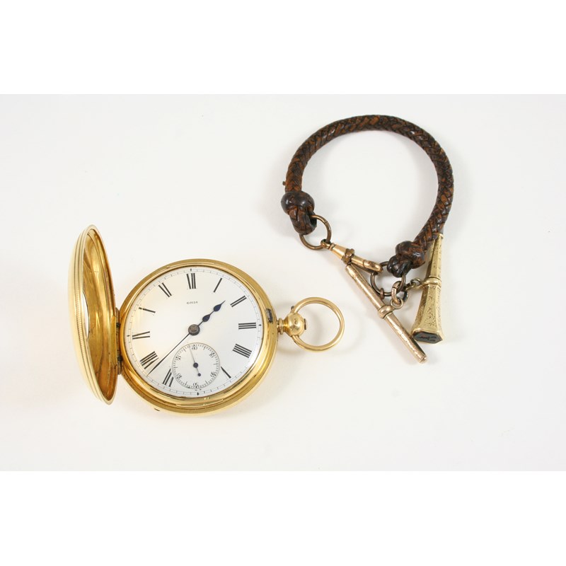 the white enamel dial numbered 60134, with Roman numerals and subsidiary seconds dial, hallmarked for London 1878, with engine turned decoration to both cases, 50mm. dia., with watch key