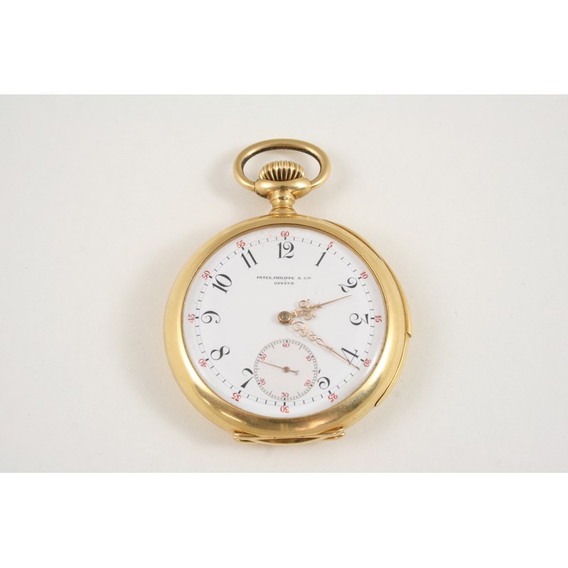 AN 18CT. GOLD OPEN FACED KEYLESS MINUTE REPEATING POCKET WATCH BY PATEK PHILIPPE
