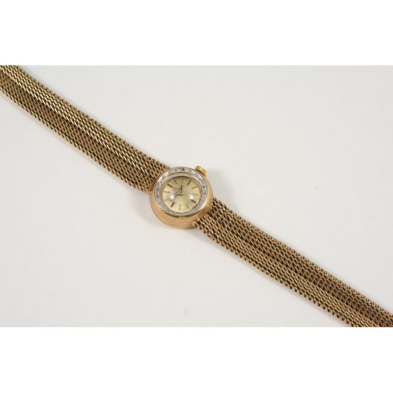 A LADY'S 9CT. GOLD WRISTWATCH BY OMEGA the signed circular dial with baton numerals, on an integrated 9ct. gold bracelet with ladder clasp, 23 grams.