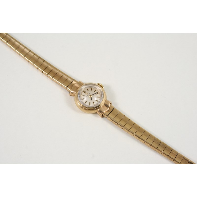 A LADY'S 9CT. GOLD WRISTWATCH BY OMEGA the signed circular dial with baton numerals, on a gold bracelet with ladder clasp, 21.9 grams.