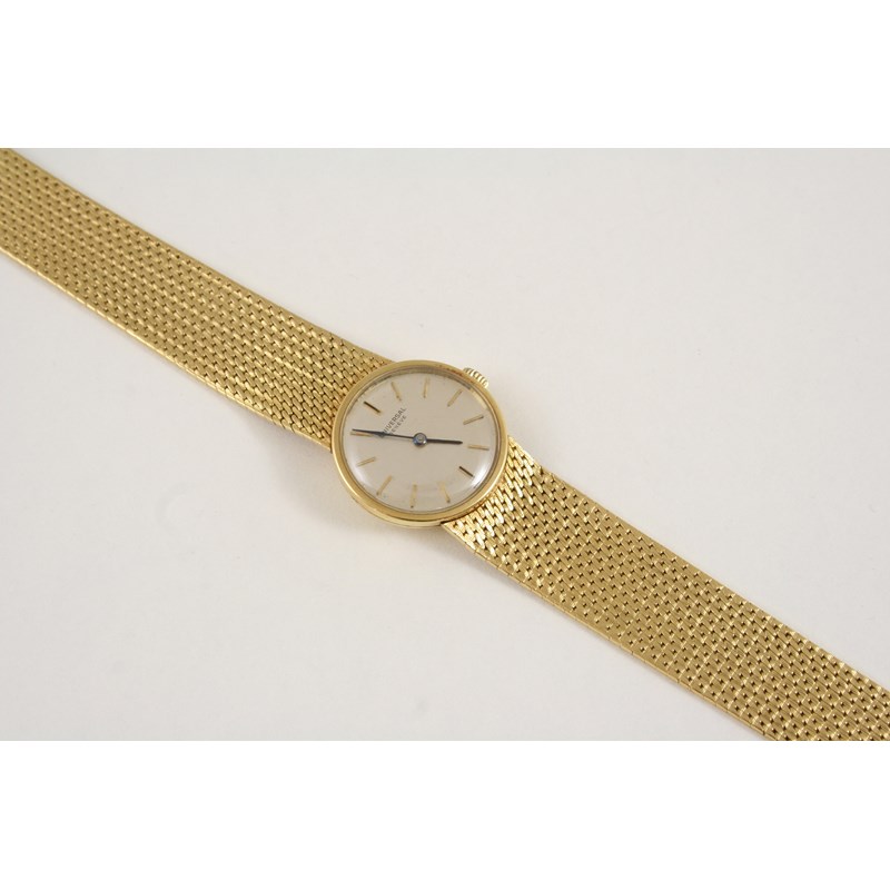 *A LADY'S 18CT. GOLD WRISTWATCH WATCH the circular dial signed Universal Geneve and with baton numerals, on an integrated gold mesh bracelet with ladder clasp.