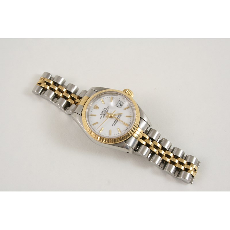 A LADY'S STAINLESS STEEL AND GOLD OYSTER PERPETUAL DATEJUST WRISTWATCH BY ROLEX the signed circular dial with baton numerals, numbered 468 B to the reverse of the bezel, on an Oyster bracelet with deployant clasp.