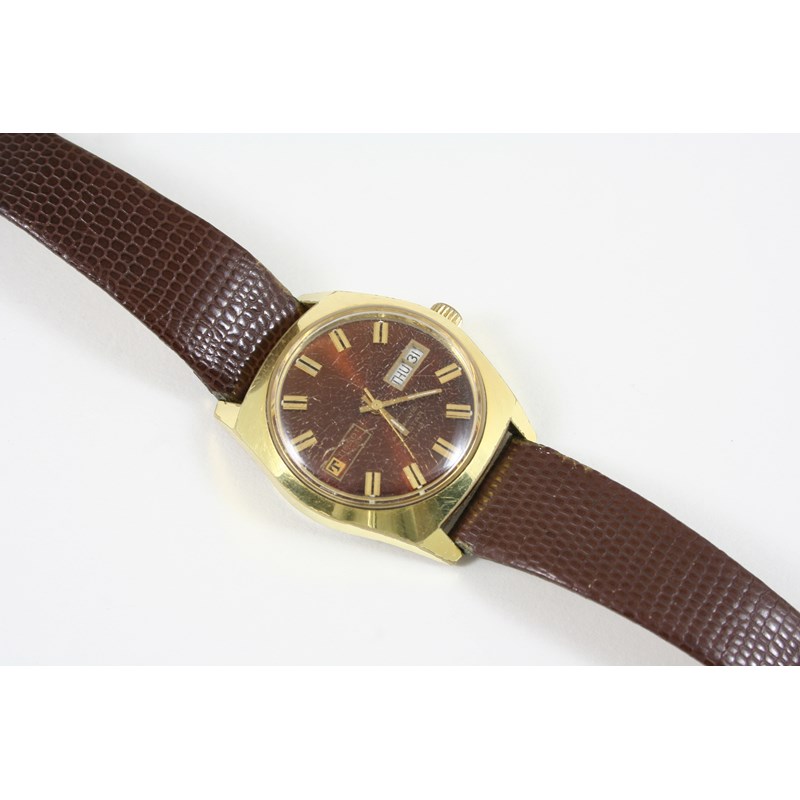 the signed circular brown dial with baton numerals and date aperture, on a brown leather strap, 32mm. dia.