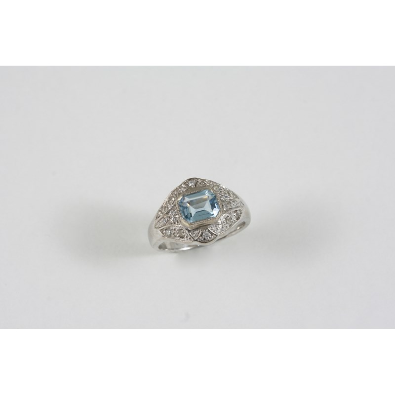 AN AQUAMARINE AND DIAMOND CLUSTER RING the step-cut aquamarine is set within a surround of small diamonds, in white gold. Size M.
