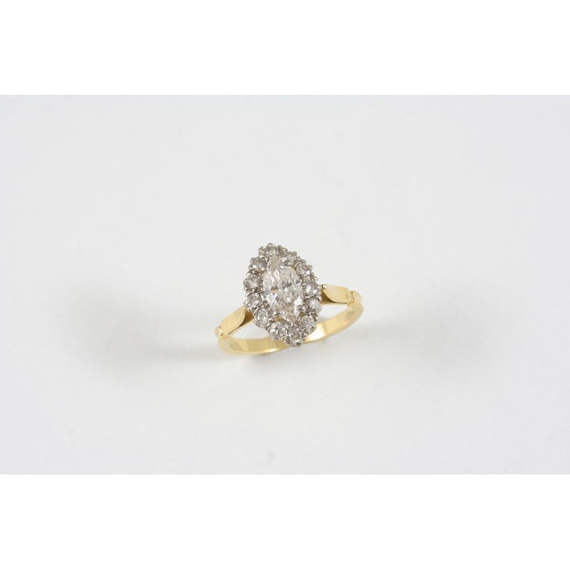 A DIAMOND CLUSTER RING the marquise-shaped diamond is set within a surround of twelve old brilliant-cut diamonds, in gold. Size K.