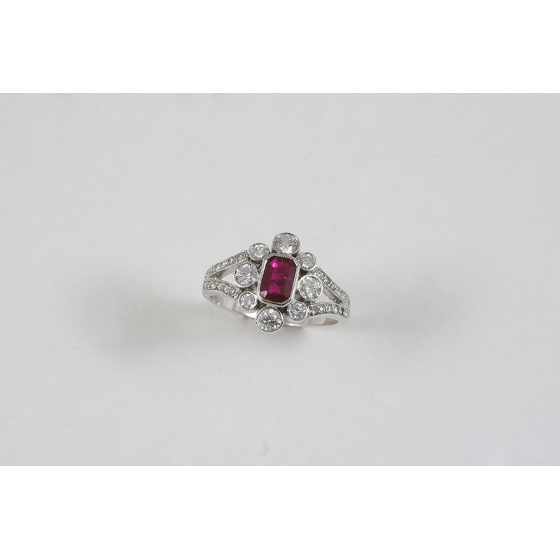 A RUBY AND DIAMOND CLUSTER RING the cut cornered rectagular-shaped ruby is set within a surround of circular-cut diamonds, in 18ct. white gold, with further diamonds set to the bifurcated shoulders. Size M.