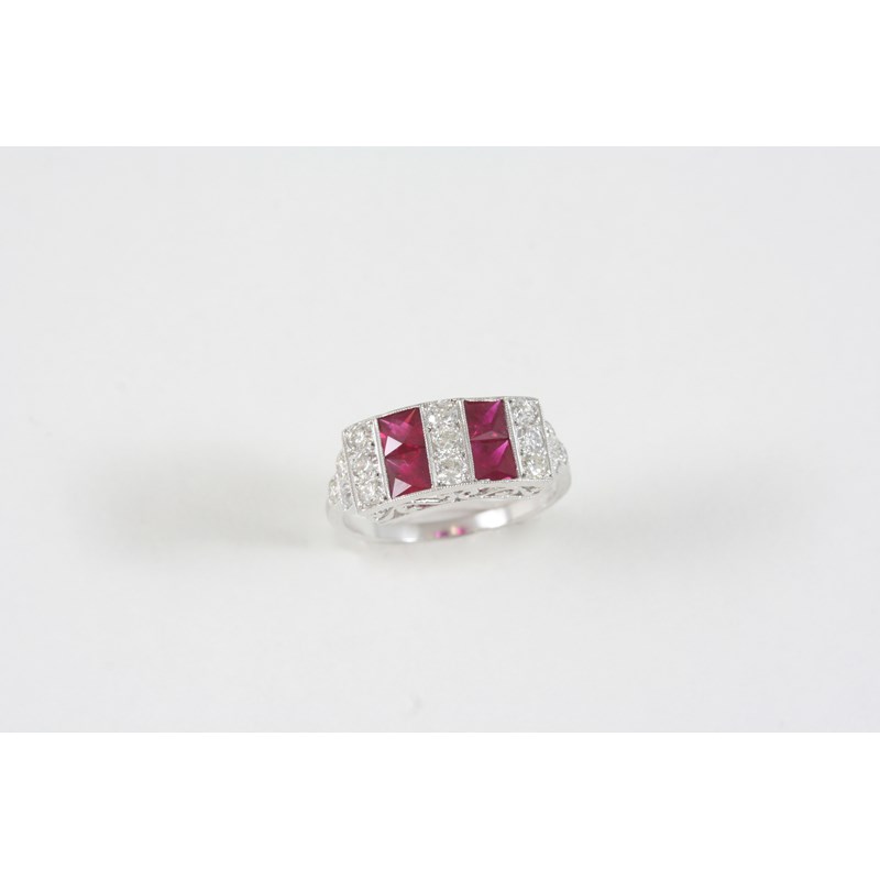 A RUBY AND DIAMOND RING the four calibre-cut rubies are set with circular-cut diamonds, in 18ct. white gold. Size O 1/2.