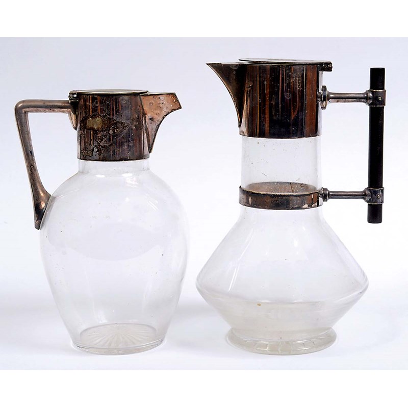 a glass claret jug with silver plated mounts and turned wooden handle, designed by Christopher Dresser for Hukin & Heath. Stamped marks, H & H, and Victorian Registration Mark. Also with another glass and silver plated Claret Jug, with an angular handle and also made by Hukin & Heath, both jugs with matching monograms to the lids. Larger Jug 8 3/4ins (22.5cms) high. (2)