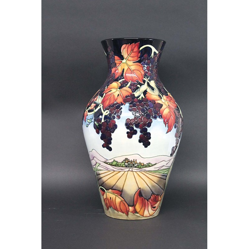 an exceptionally large limited edition Moorcroft vase in the Montegnac design, with fruiting vines and a Chateau in a landscape. Designed by Emma Bossons and No 52 of 100 produced. Marked, Moorcroft, Made in England, signed by Emma Bossons, 2000. 24 1/2ins (62cms) high