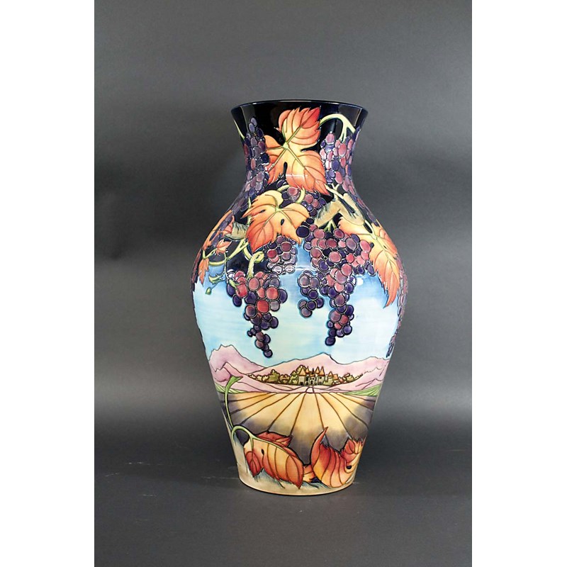 an exceptionally large limited edition Moorcroft vase in the Montegnac design, with fruiting vines and a Chateau in a landscape. Designed by Emma Bossons, and No 5 of 100 produced. Marked, Moorcroft, Made in England, signed by Emma Bossons, 2000. 24 3/4ins (63cms) high