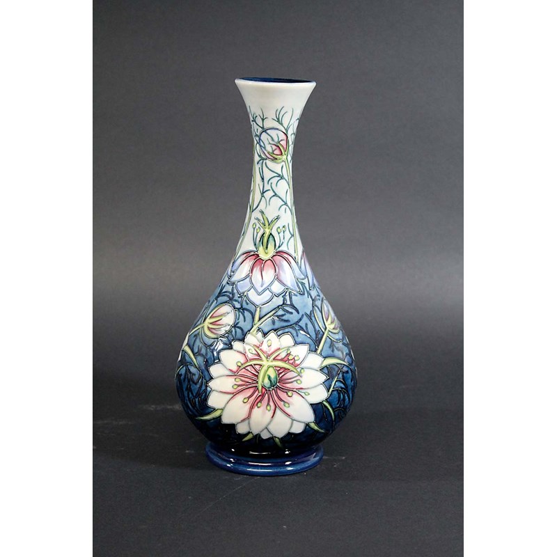 a boxed modern Moorcroft limited edition vase in the Love in a Mist design. Designed by Rachel Bishop and No 46 of 300 produced. Marked, Moorcroft, Made in England, 95, 46/300. 12 1/4ins (31cms) high