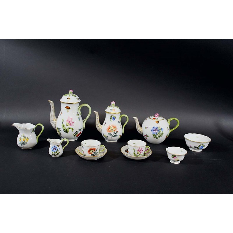 including 24 coffee cups and 24 saucers, coffee pot (Model No 1477), Small Teapot (1474), Small Hot Water Jug (1478),milk jug and cream jug, and 2 sugar bowls. All painted in the Fruits & Flowers design, and each marked Herend Hungary. (55)