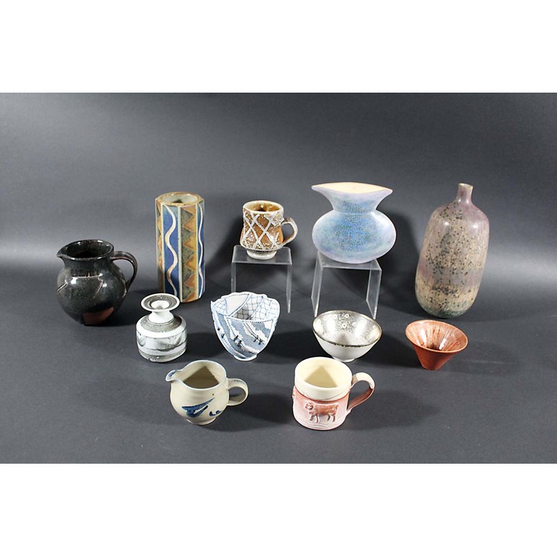 a mixed lot including a George Wilson porcelain bowl with metallic interior, a small stoneware jug by Phil Rogers, a small vase by Mary Rich, a stoneware vase with high fired glaze (paper label D Davis, 3/73), a Harry Davis jug (Gowan Pottery), a slender vase by Loretta Braganza, Paul Barrow jug, a porcelain vase by Linda Chew, Philip Wood mug, a Ramarama pottery charger (New Zealand), and various other items (not all shown in the image).