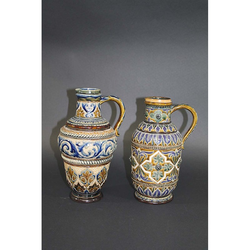 two Doulton Lambeth jugs by Frank Butler, both with painted and embossed decoration. One Jug marked, Doulton Lambeth, FAB (Frank Butler), 897, 1884, HH, and the other marked, Doulton Lambeth, FAB, 584, 1879. Largest Jug 11ins (28cms) high, The Other 10 1/4ins (26cms) high. (2)