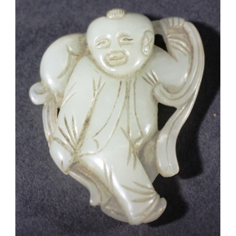 CHINESE NEPHRITE JADE FIGURE OF A CONFUCIAN BOY, carved walking and carrying a ball or bag, height 6cm