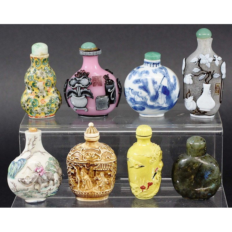 COLLECTION OF EIGHT CHINESE SNUFF BOTTLES, to include Peking glass, hardstone, blue and white porcelain and other examples (8)