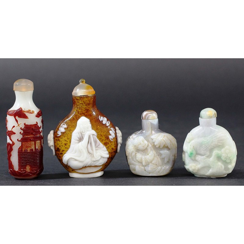 GROUP OF FOUR CHINESE SNUFF BOTTLES, to include red glass cut through to white, aventurine and hardstone examples (4)