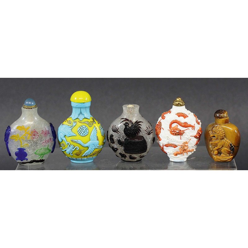 GROUP OF FIVE CHINESE SNUFF BOTTLES, to include Peking glass and relief moulded porcelain examples (5)