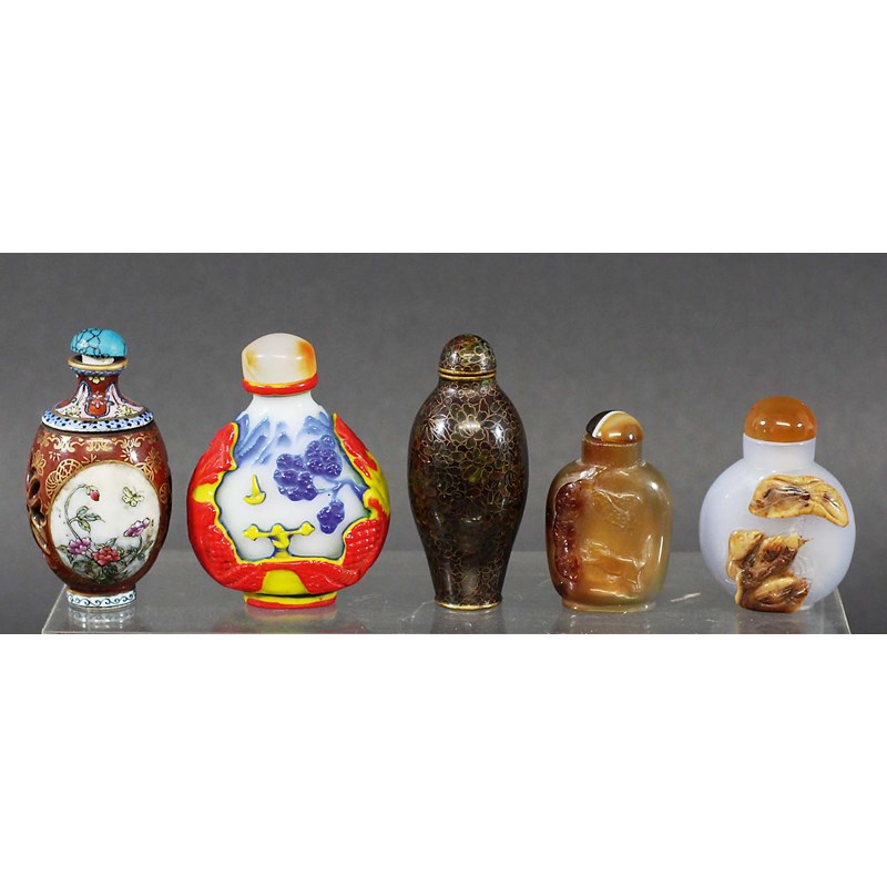 GROUP OF FIVE CHINESE SNUFF BOTTLES, to include a four colour glass, porcelain and hardstone examples (5)