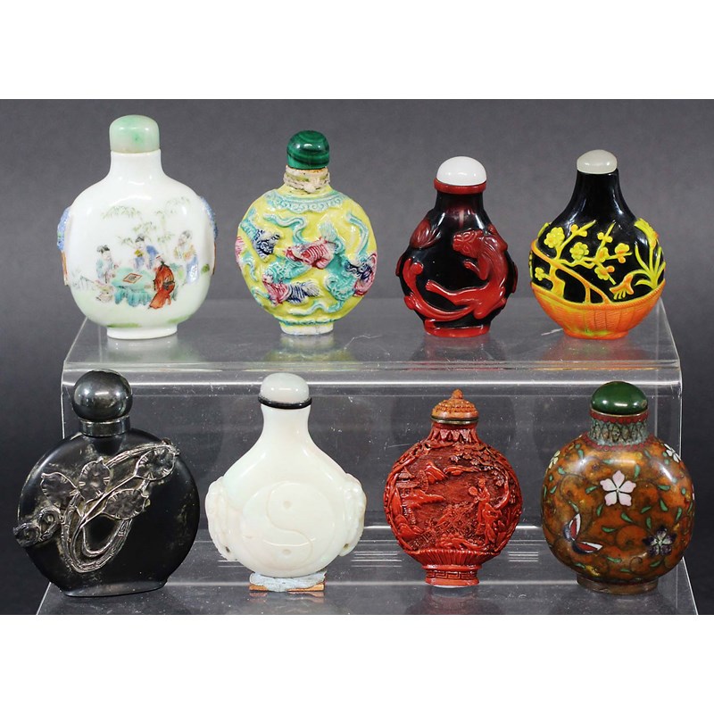 COLLECTION OF EIGHT CHINESE SNUFF BOTTLES, to include red lacquer, porcelain and Peking glass examples (8)