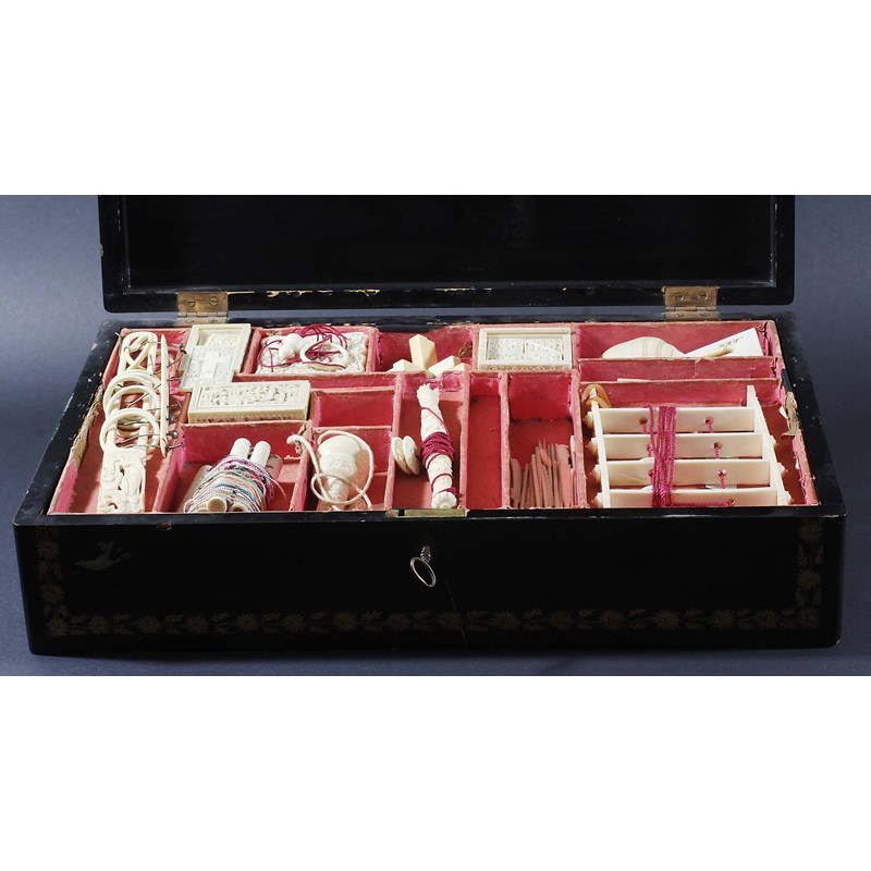 CHINESE BLACK LACQUERED GAMES BOX AND CONTENTS, 19th century, with gilt foliate decoration, the fitted interior with numerous ivory games, box dimensions height 10.5cm, width 43cm, depth 26.5cm