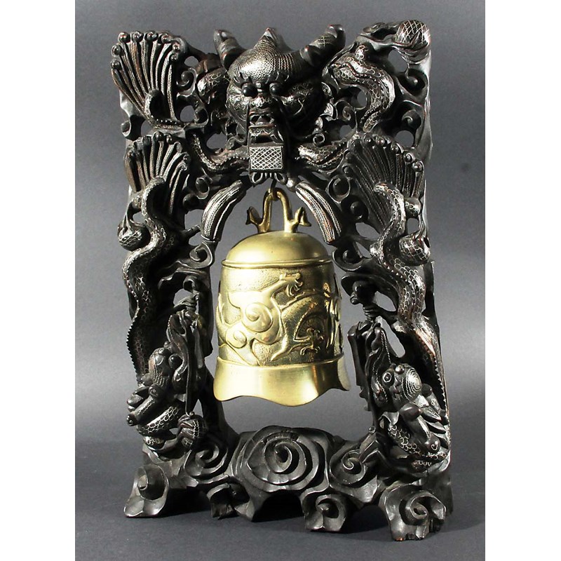CHINESE BRASS TEMPLE BELL, cast with scrolling dragons, on a hardwood and white metal inlaid frame a central dragon mask above scrolling kylins, height 47cm, width 32cm