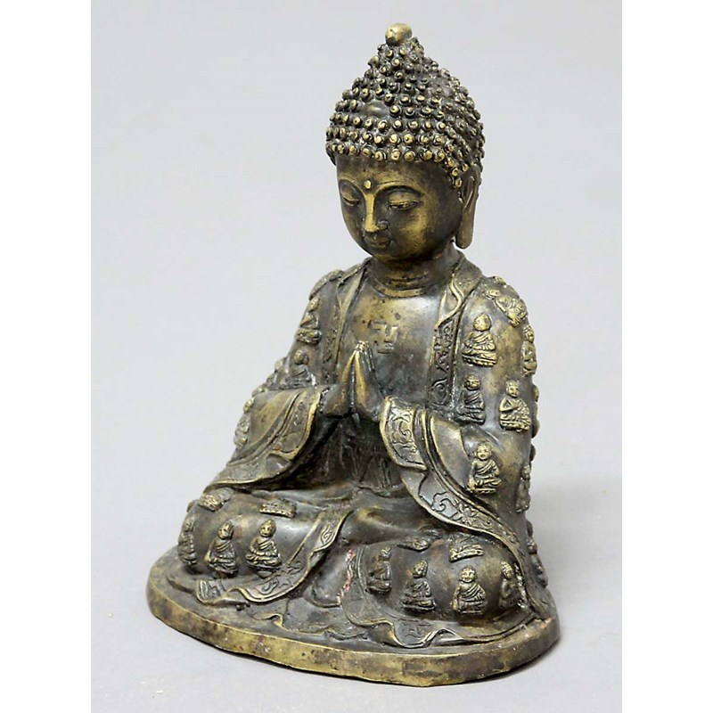 BRONZE BUDDHA, seated with hands together, a swastika on the chest, wearing a 1000 buddha robe, height 22cm