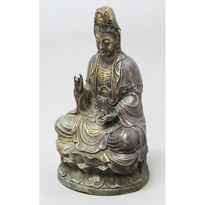 BRONZE GUANYIN, seated on a double lotus base, hands in mudra, height 34cm