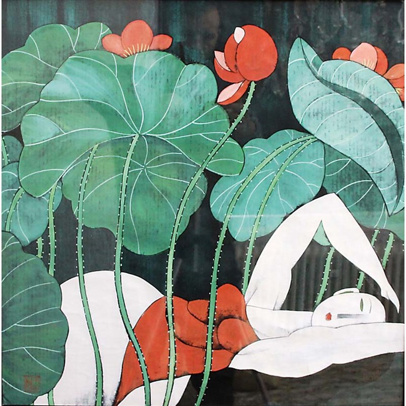AFTER HU YONKAI, Lady in a red corset amongst lotus leaves and flowers, gouache, red seal mark lower left, 59cm x 59cm