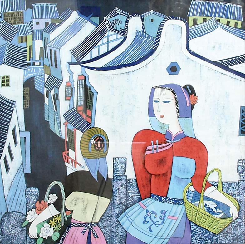 AFTER HU YONKAI, Chinese ladies with baskets before a town, gouache, iron red seal lower right, 59cm x 59cm