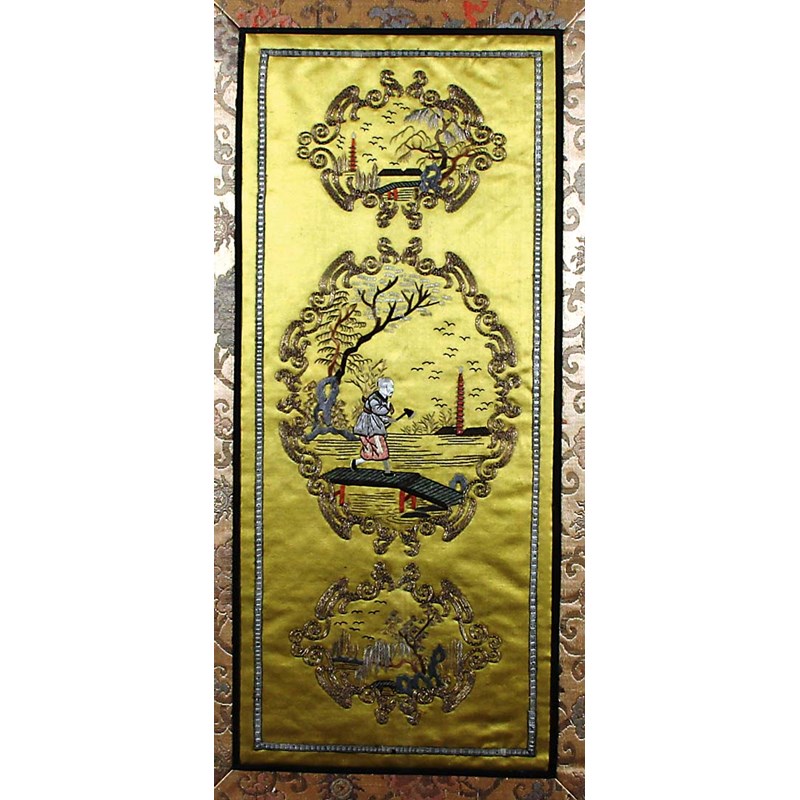 CHINESE SILK PANEL, the central image of a man on a bridge between two smaller scenes, each with gilt thread scrolling frames on an Imperial yellow ground, height 58cm, width 30cm