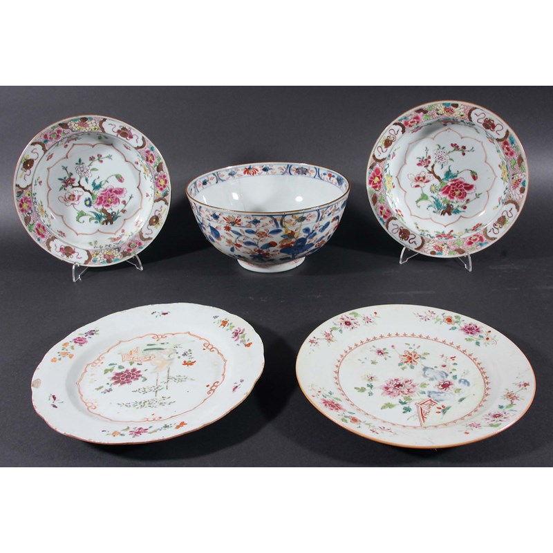 PAIR OF CHINESE FAMILLE ROSE SOUP PLATES, late 18th century, enamelled with flowers, diameter 22cm; together with three other plates and two imari fruit bowls (7)