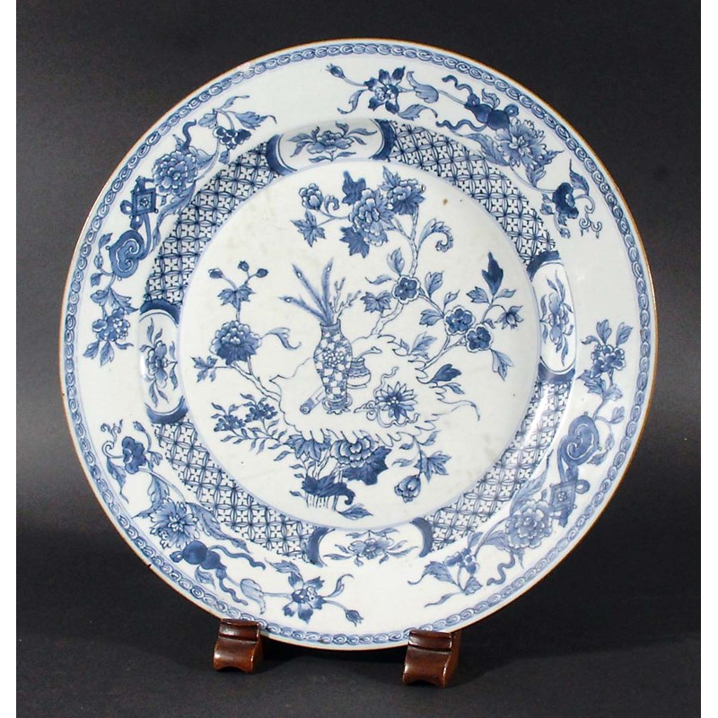 CHINESE BLUE AND WHITE CHARGER, painted with vases and flowers inside a trellis rim and floral border, diameter 35cm
