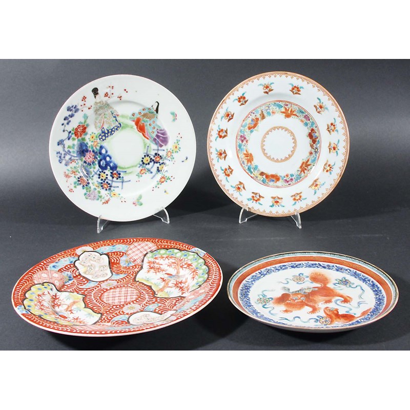 probably Qianlong, painted and gilded with bands of foliage, diameter 23cm; a famille verte plate, 18th century, enamelled with two figures in a garden, diameter 23cm; a saucer dish painted and enamelled with a dog of fo and her puppies, diameter 20cm; and another plate with cartouches of birds in branches, diameter 25cm (4)
