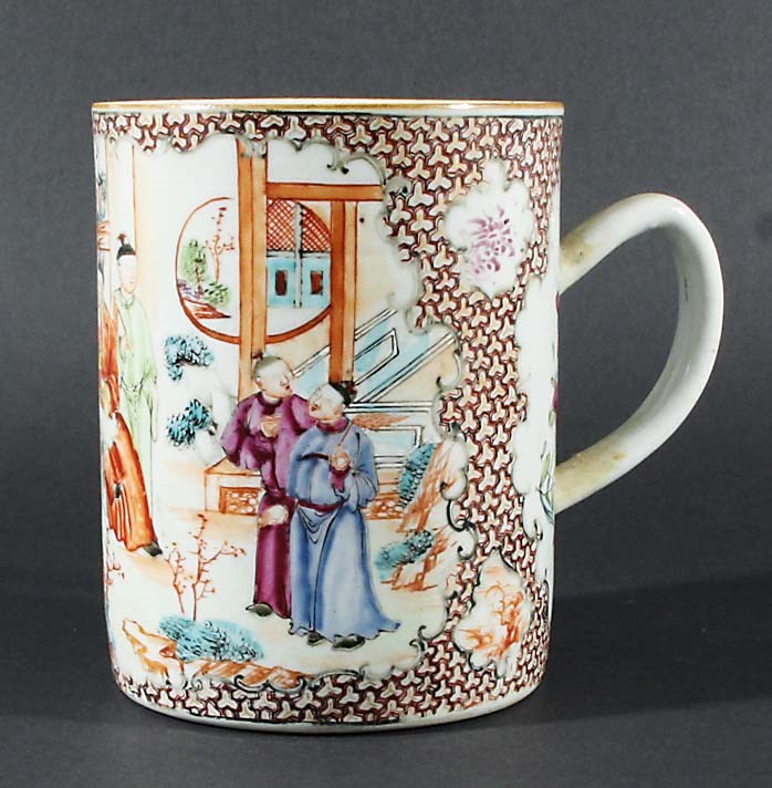 CHINESE FAMILLE ROSE TANKARD, late 18th century, enamelled with courtesans seated in a garden, height 16cm
