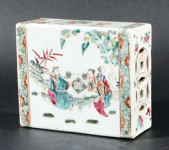 CHINESE FAMILLE ROSE BRICK PILLOW, 19th century, enamelled with scenes of figures playing board games and drinking wine, height 12cm, width 14.5cm, depth 6cm