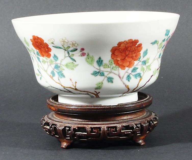 CHINESE FAMILLE ROSE BOWL, Yongzheng mark but probably later, enamelled with peonies, underglaze blue six character mark, with hardwood stand, diameter 17.5cm (2)