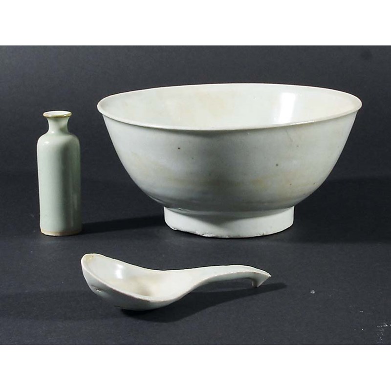 possibly Song, carved with stylised floral decoration under a pale celadon glaze, height 7.5cm; together with a Tek Sing rice bowl and spoon with a pale turquoise glaze, bowl diameter 16cm (3)