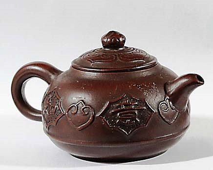 CHINESE YIXING BROWN STONEWARE TEAPOT AND COVER, with ruyi and cartouche decoration, impressed four character seal mark, length 15.5cm