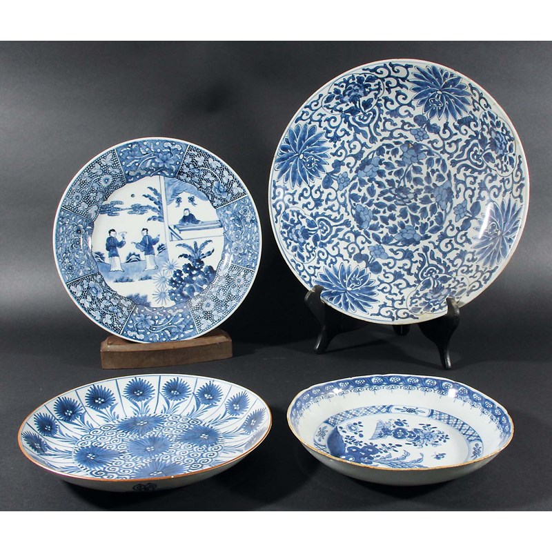 Kangxi, blue painted with flowers on a scrolling ground, stylised flowerhead inside a double circle, diameter 39cm; together with a small charger, Qianlong, painted with three figures inside a panelled border, diameter 31cm; and two further saucer dishes, later 18th or 19th century, painted with stylised flowerheads and a flowering, rocky garden (4)