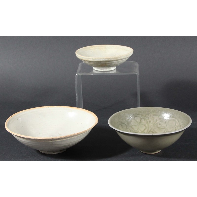 Song or Yuan, with a pale grey glaze under an unglazed rim, diameter 14.5cm; together with a dish, probably Song, in a grey glaze and a Longquan style bowl with carved decoration of two Confucian boys beneath a green glaze (3)