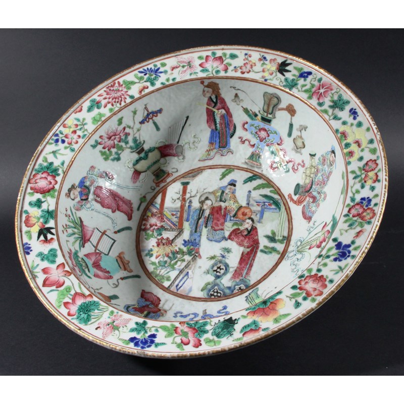 possibly late 18th century, enamelled in the Canton style with birds, butterflies, flowers and fruit to the ewer and cover, the basin with three figures in a garden surrounded by further figures, vases, flowers and other scholarly items inside a floral border on an orange peel textured ground, matched, height of ewer 29cm, diameter of basin 42cm (3)