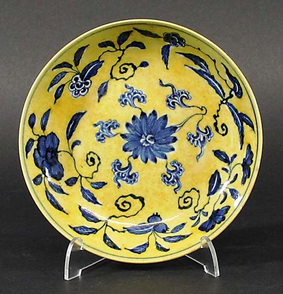 CHINESE MING STYLE YELLOW GROUND SAUCER, Daoguang, underglaze blue painted with flowers and foliage, the underside similarly decorated, diameter 16cm