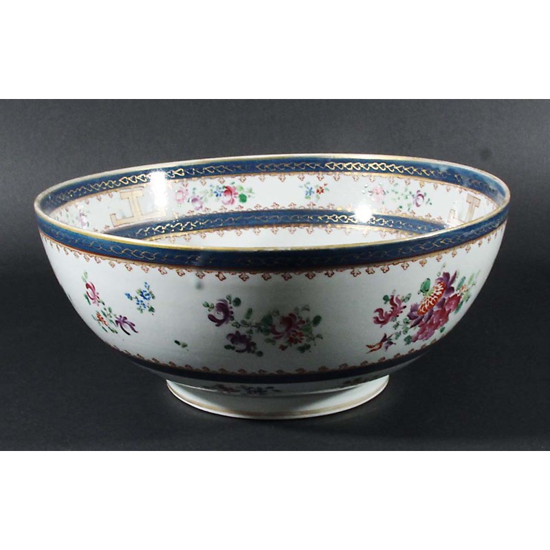probably 19th century, painted with lotus and chrysanthemum inside a floral and banded border, the exterior similarly decorated, iron red mark to baser, diameter 30cm