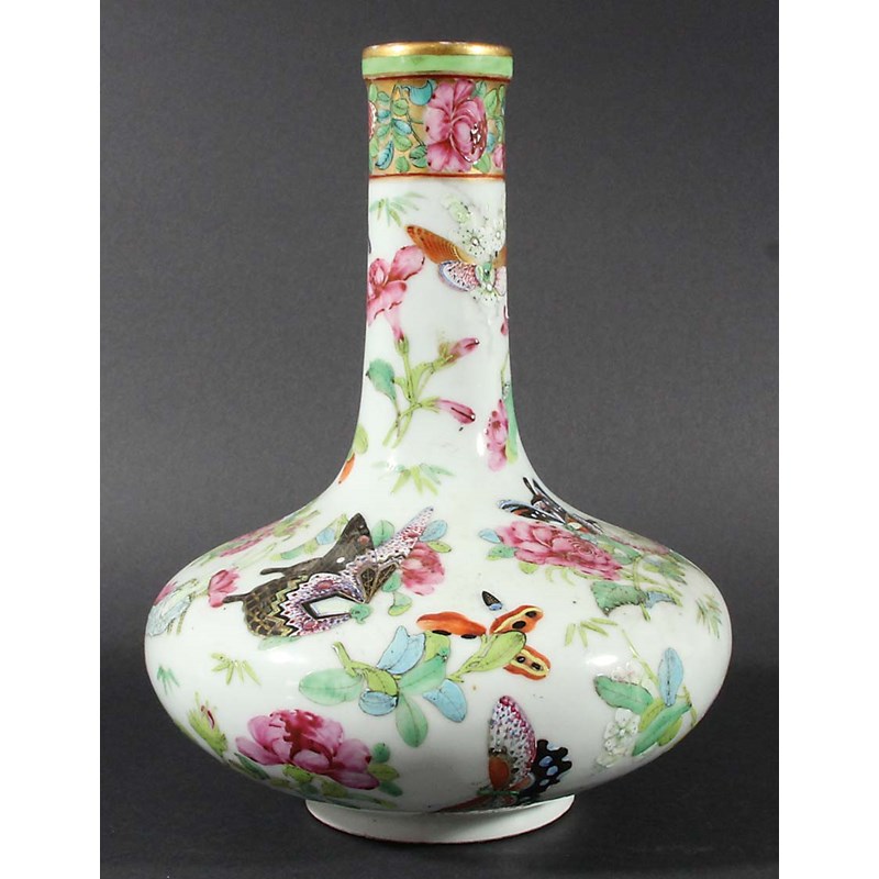 CHINESE FAMILLE ROSE BOTTLE VASE, 19th century, painted in the Canton style with butterflies, peaches, gourds and flowers, height 26cm