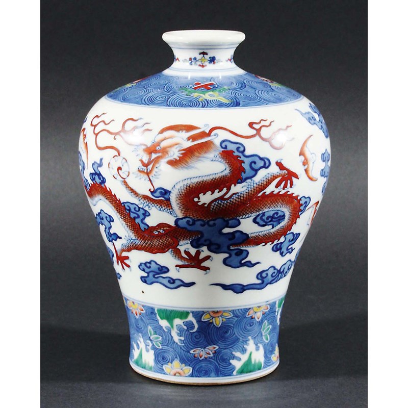 CHINESE WUCAI MEIPING VASE, Yongzheng style but later, decorated with scrolling dragons chasing flaming pearls, blue painted six character mark, height 21cm