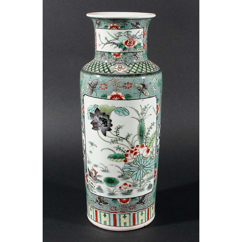 CHINESE FAMILLE VERTE ROULEAU VASE, painted with rectangular panels of foliage on a speckled ground with fish, butterflies and flowers, blue double circle to the foot, height 30cm