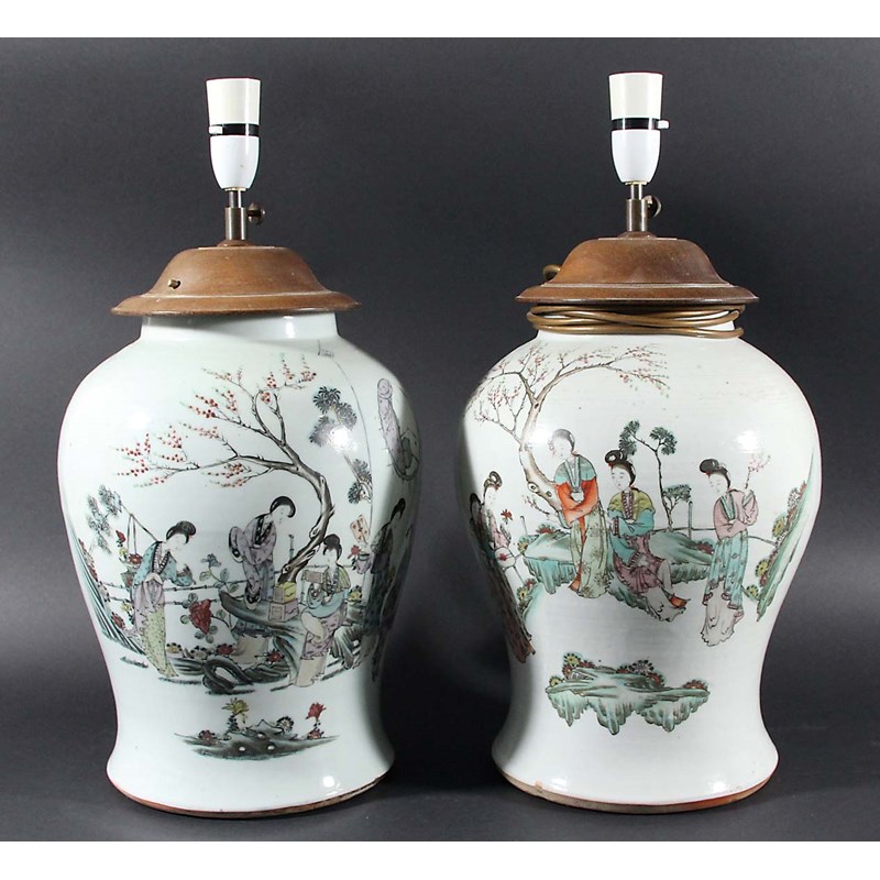 painted with scenes of maidens in gardens, each with a five line inscription to the reverse, later turned wood covers fitted for electricity, height excluding covers 34cm (2)