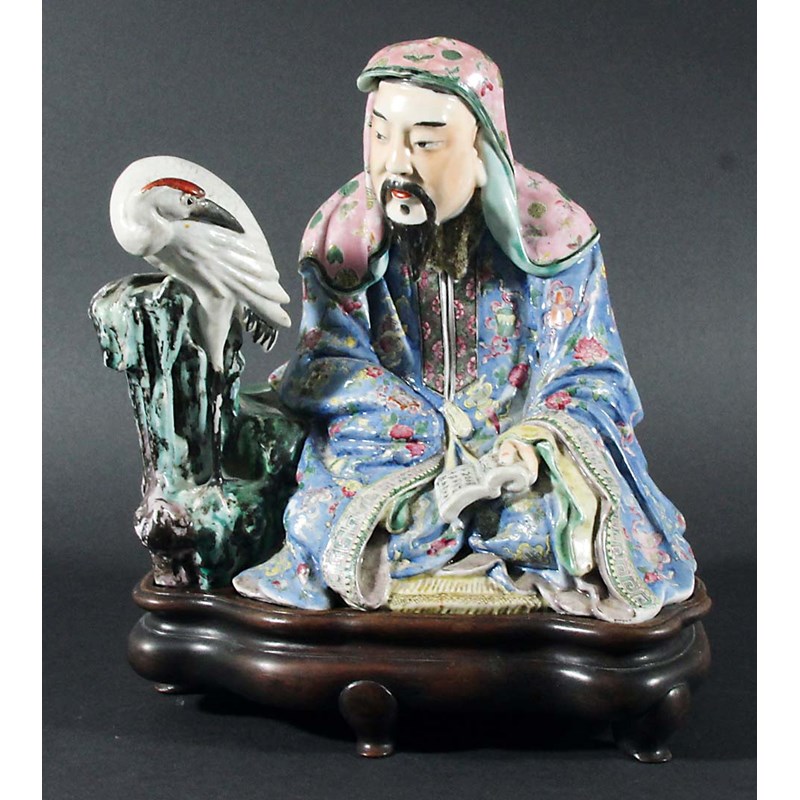 CHINESE ENAMELLED GROUP, of a sage seated with a stork, a book on his lap, in Canton style enamels, with hardwood stand, impressed seal mark, height excluding stand 20cm (2)
